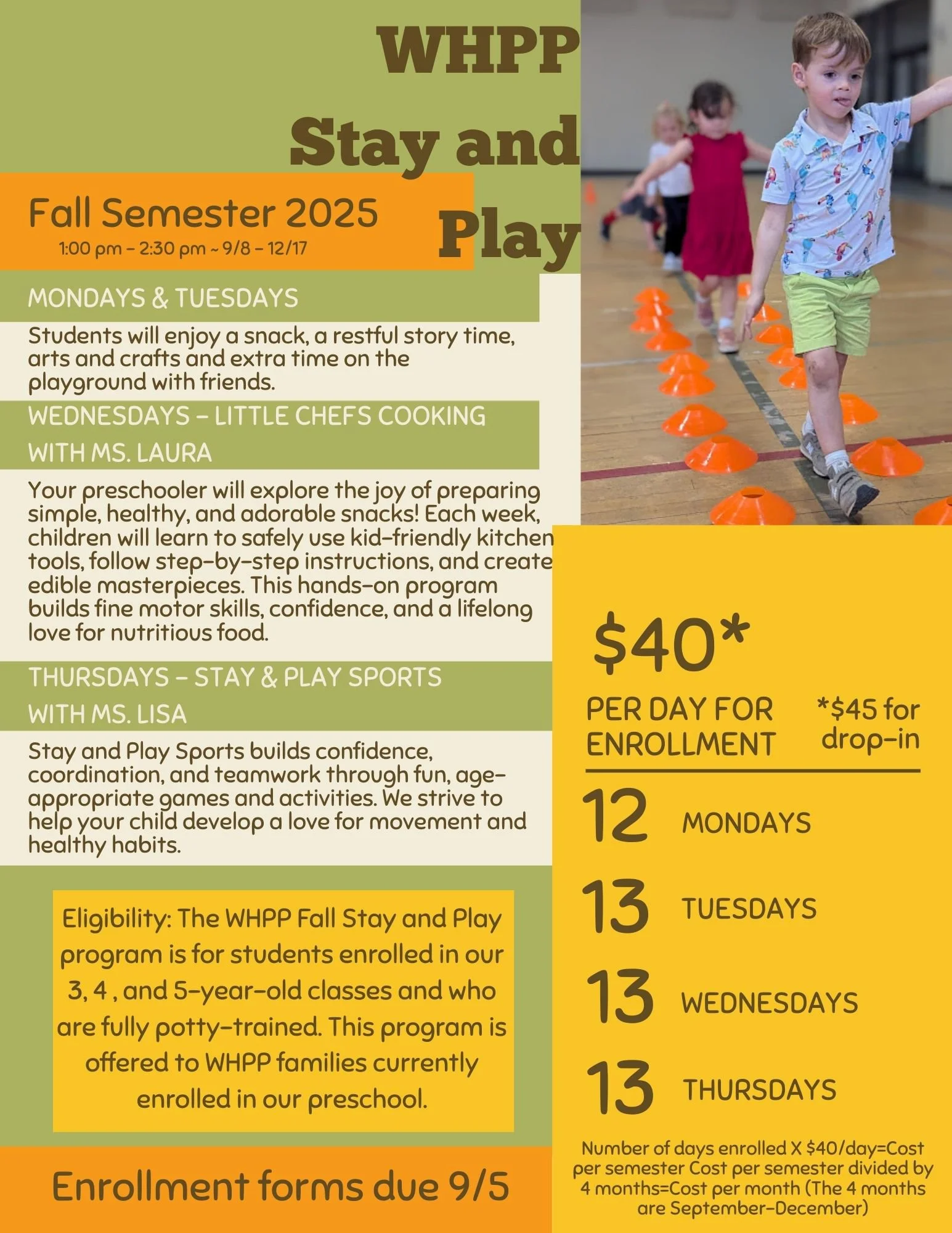Upon receipt of a completed application and payment of the $50 application fee, Children are placed on the wait-list for their class group. Priority is given to children currently enrolled, siblings of children currently enrolled, staff members, WHPC church members and former WHPP families. The general wait-list is then prioritized by date of application. Class placement is based on age, date of applications, room size, gender ratio and the discretion of the Director. Enrollment is complete upon receipt of all required forms and the prepayment of May tuition.